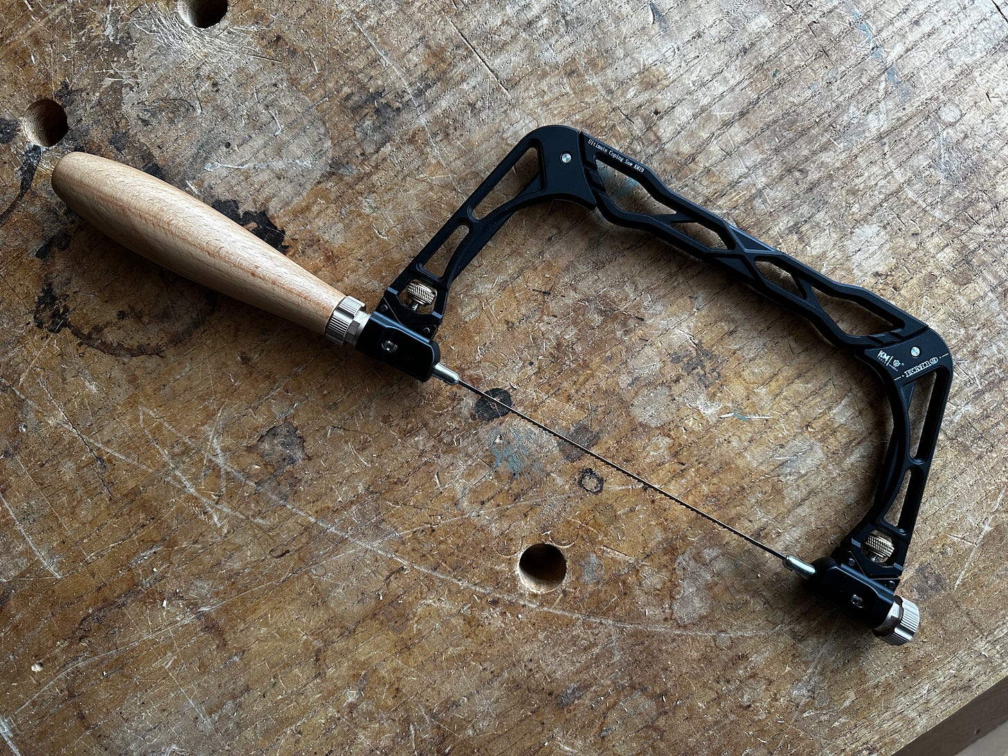 Knew Concepts was the first modern toolmaker to redesign the old form of coping saw. And it was a huge improvement (except for the handle). You tension and de-tension the blade with a lever. The blade holders lock in detents to keep the blade at the correct angle. And the aluminum frame is light.