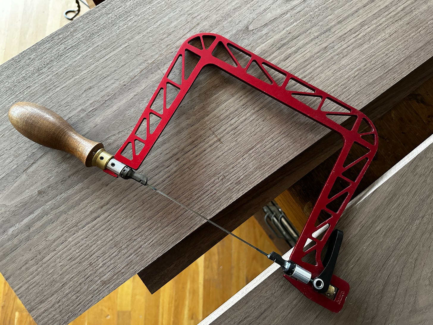 Dave Jeske at Blue Spruce Toolworks took the next giant leap with his coping saw. It’s smaller, uses carbon fiber to keep the weight down (at 9.6 ounces), has the best handle of any coping saw ever made and allows you to unlock the blade so it rotates freely while the blade is in tension. This somewhat miraculous feat allows you to cut in all directions while scrolling while the frame swivels out of the way freely.